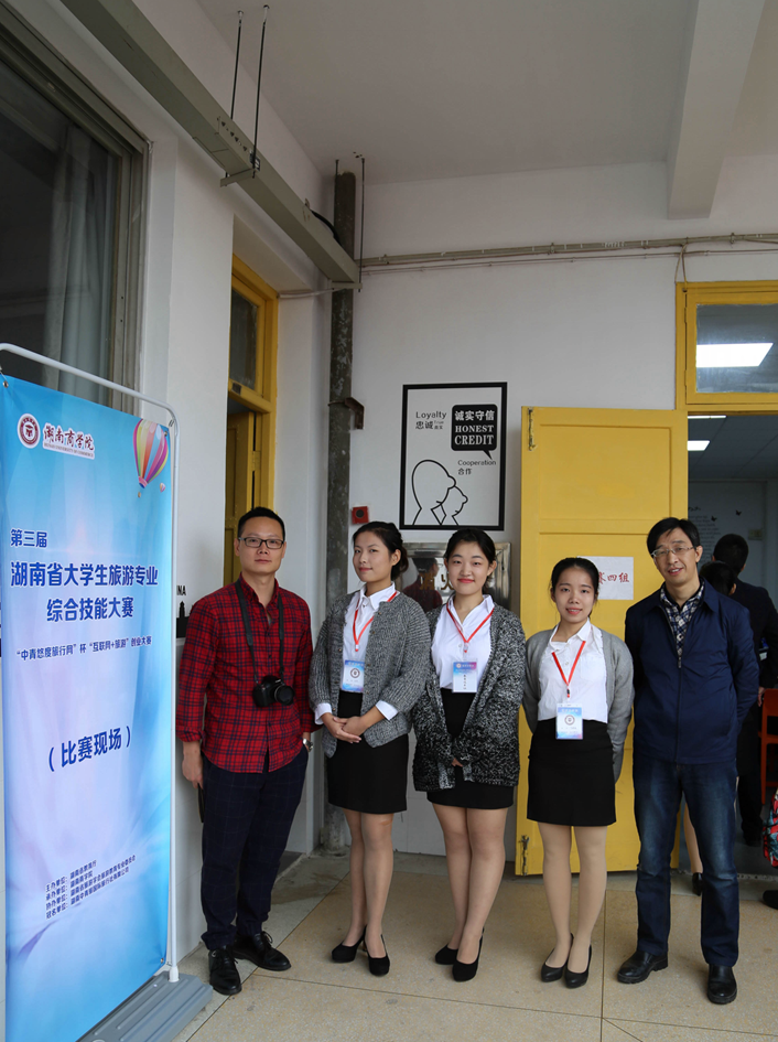 2016年11月6日,第三届湖南省老员工旅游专业综合技能大赛顺利进行,此次竞赛由湖南省教育厅主办,湖南商公司承办,共吸引省内26所高校的61支队伍参赛。公司共派出两支参赛队伍,均获得优异成绩。其中由刘晓燕老师指导的李琪瑶、郭裕玲、高睿等三名同学共同完成的“旅购”项目获得二等奖;由李克强老师指导的罗司琪、胡佳、梁新元等三名同学共同完成的“分时声旅”项目获得三等奖。