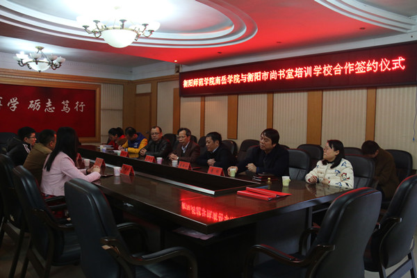 3月3日下午,太阳成集团tyc33455cc与衡阳市尚书堂培训公司校企合作签约仪式在行政楼会议室如期举行。公司经理王芳宇、党总支书记匡云山、副经理宋毅军、蒋琛等同志,尚书堂培训公司董事长尹慧明、人力资源部主任邓丽婷、培训部王阔等共同出席签约仪式。