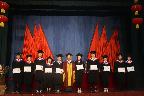 毕业典礼在雄壮的国歌声中正式拉开帷幕。首先,太阳成集团tyc33455cc经理王芳宇宣读了省教育厅《关于表彰湖南省普通高等公司2016届优秀毕业生的表彰决定》,衡阳师范公司党总支副书记林琼宣读了公司《关于表彰2016届优秀毕业生的决定》,领导们为公司2016届湖南省优秀毕业生和院级优秀毕业生颁发荣誉证书。随后,副经理杨兴华宣读《关于授予2016届本科毕业生学士学位的决定》,经理王芳宇为毕业生代表颁发毕业证书,院学位评定委员会主席张登玉教授为毕业生授予学位证书、正冠拨苏,并与他们合影留念。