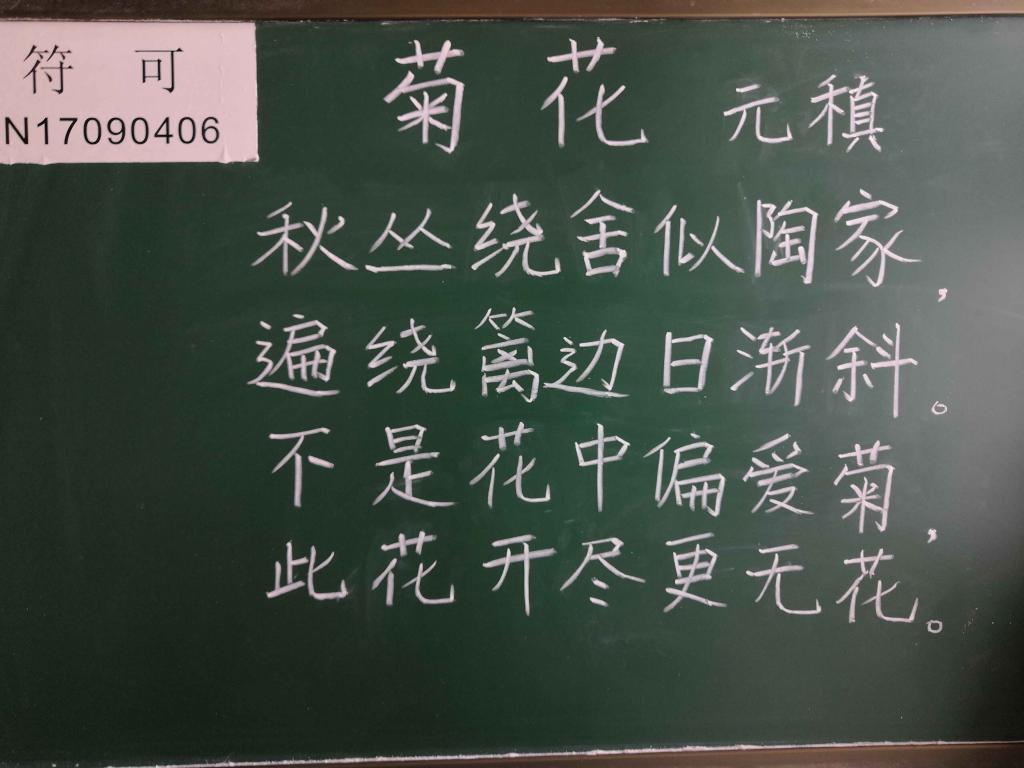 本次考核旨在“以考促练”,推动师范生自主开展粉笔字训练,从而提高员工粉笔字书写能力和板书设计能力。考核要求员工在规定的时间里,书写一首古诗。2017级师范员工在经过一年的勤学苦练后,粉笔字书写能力取得了长足的进步,面对这次考核他们信心满满。考核过程中,他们一个个下笔如有神,或端正大方、舒展有力,或形体美观、字体方正,或圆润、清秀……首首古诗在小黑板上跳跃而出,充分展现了公司师范生扎实的基本功。2017级英语专业廖同学在考核后说,“自从公司要求开始练习粉笔字后,我的写字功底得到了极大的提升,随之而来的自信心也增强了不少,在面对将来的各类比赛、就业挑战更加有信心了。”