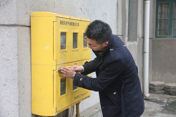 经理邓双喜在教师家属区清理天然气盒上的“牛皮癣”