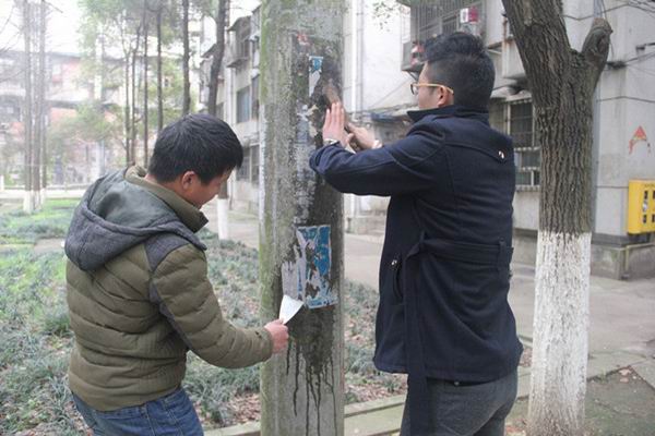 音乐与体育系两名男生在清理教师家属区电线杆和天然气盒上的小广告
