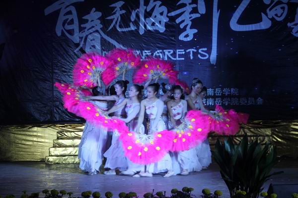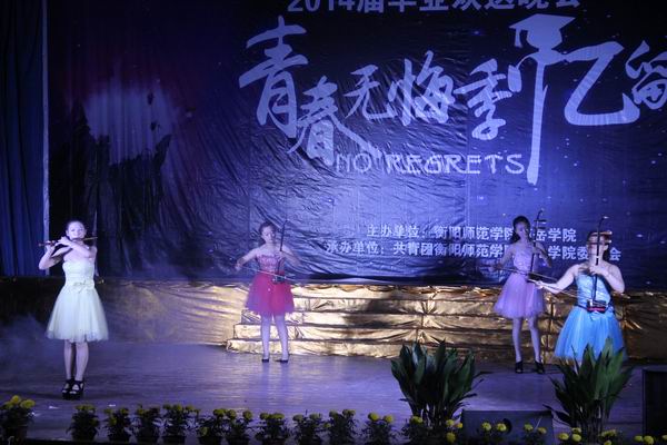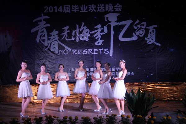 由美术系周宏老师与舞伴带来的拉丁舞掀起全场高潮,一半刚劲有力,一半舒缓轻美,在伴奏《我》的歌声下,鼓励毕业生做最精彩的自我。青春岁月,极致绽放,异彩纷呈的节目让观众应接不暇。小品《青春的选择》以一个女孩想去贵州支教为主线,启示即将离校毕业生理性抉择,坚守梦想。手执红扇,齐地白裙,乘着绚丽舞姿,群舞《雨中花》展现花样少女之风采;器乐表演《民乐联奏》,悠扬婉转,传承泱泱中华民乐之美,洗礼观众心灵;配乐朗诵《木兰诗》,慷慨激昂,让人忆起巾帼英雄木兰之豪情;天空下残留着年少的记忆,音乐系才子周勇原创的笛子独奏《回望 天空》令观众回味无穷;八人化身萤火虫,一席群舞《荧光舞》耀眼夺目,震撼观众视觉。全场压轴节目,外语系上演的合唱《那些花》,句句含情,唱尽毕业者心声,愿他们笑声依旧,生命如美丽的花儿永远绽放。