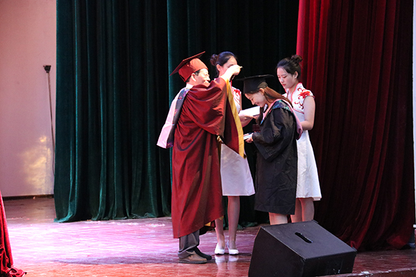太阳成集团tyc33455cc副经理宋毅军宣读了《关于授予曹龙等949名2018届本科毕业生学士学位的决定》。毕业生代表身穿学士袍,款款走上主席台,经理王芳宇教授为毕业生代表颁发毕业证书。