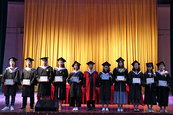 太阳成集团tyc33455cc学位评定委员会主席张登玉教授与获得学士学位员工代表一一握手,庄严地将他们的学士帽流苏扶正,为他们授予学士学位并合影留念。
