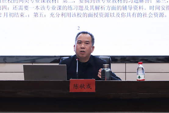 陈秋成老师就如何准备考研、为什么考研两方面展开了全面的讲解,对各学科的考研难度进行深入浅出、细致入微的分析。在考研学科方面,陈老师强调了考研英语和考研政治需注重日常积累与学习,对题型和知识点需掌握透彻。他对于考研同学该如何进行高信心、强决心地备考提出了三点建议,一是事预则立,不预则废;二是定位客观,顺序正确;三是规划全程,导学细则。他希望同学们以正确的、良好的心态对待考研,珍惜时间,立足当下。