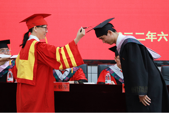 副经理宋毅军宣读《关于授予曹文宇等1008名2022届本科毕业学士学位的决定》,经理王芳宇为毕业生代表颁发毕业证书,院学位评定委员会主席李玲玲为获得学士学位的毕业生代表拨穗正冠,颁授学位。