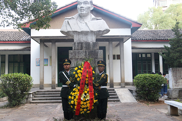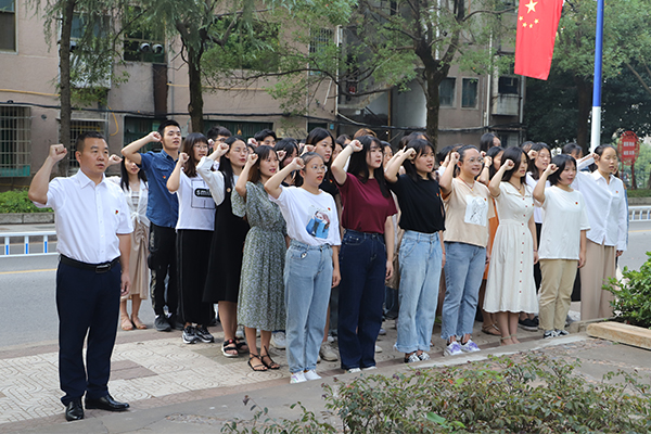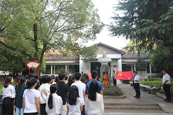 仪式伊始,两名军事教导队队员身着戎装、迈着正步向蒋先云烈士敬献花篮。在场全体人员肃立,向蒋先云烈士雕像默哀,表达对革命烈士的无限哀思与崇敬之情。随后,周华副书记宣读了2019年上半年新发展党员名单。在周华副书记的带领下,全体预备党员在烈士纪念雕像前庄严宣誓,短短80字的誓词是他们不忘为中国人民谋幸福、牢记为中华民族谋复兴的承诺。