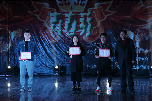 晚会的最后,评委老师通过选手的整体水平、感染力、创意等方面的表现,结合微信平台的网上投票结果,秉承公正、公平、公开的原则,决出了每个版块的一、二、三等奖及优胜奖。其中,舞台剧《雨巷》、歌曲《浮夸》、舞蹈《hot pink》夺得一等奖;小品《傻子上学》、歌曲串烧《再见》、热舞《kingdom come》获得二等奖;朗诵《觉醒之路》、歌曲《旅行的意义》、舞蹈《let’s happy》获得三等奖;此外,热舞《kingdom come》和歌曲《对你爱不完》分别获最佳人气奖和最佳优胜奖。各领导分别为以上获奖节目颁发证书和奖品。
