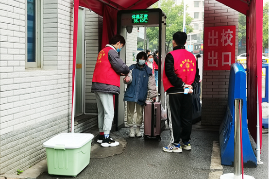 在西校区北门,公司设置了多站式通道,返校员工出示健康码后依次通过红外体温监测通道进入校园。志愿者们早早地来到公司门口,维持现场秩序,协助返校员工进行温度测量、身份核验、查验健康码和返校码,帮助同学们顺利返校。在志愿者的引导下,现场秩序井然。