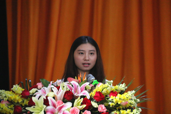 2014级外语系邵雨柔同学代表老生发言。她结合自身两年的生活经历,给新生的老员工活提出了宝贵建议,鼓励新生积极参与校园活动和社会实践活动,在努力学习的同时培养自身各方面的能力,完成从中学时代到老员工活的完美蜕变。
