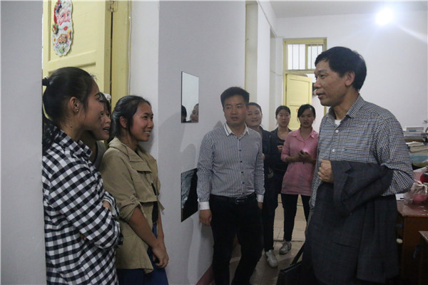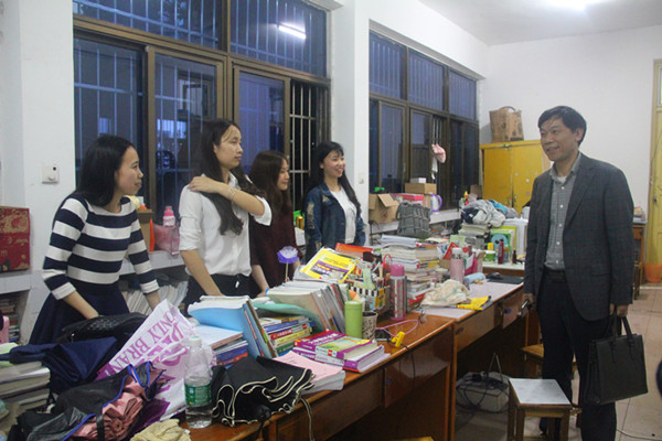 4月14日晚21点,在公司党总支书记高峰、经理邓双喜、党总支副书记林琼、副经理杨兴华的带领下,全体科级干部和辅导员老师再次齐聚宿舍管理中心,分组走访了女生宿舍,了解员工的在校生活情况。