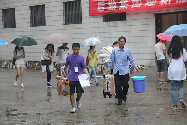 路途遥远,但不少新生仍在家长的陪同下早早来到迎新现场报到。员工家长们替孩子扛着重重的行李,孩子们替父母撑伞遮雨。新生报到处坐着一对夫妻,神情虽喜悦又透露着担忧。记者上前询问得知,是前来报到的吴同学的父母,吴爸爸说:“孩子从来没离开过身边,第一次自己独立生活,我们还是有点不放心,她从小独立能力就差,我希望她能尽快适应老员工活,多与老师同学沟通交流,有问题可以及时咨询老师。”